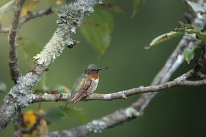 A beautiful hummingbird searching an apple tree for a midday treat.