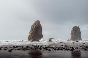 Twin rock towers standing off the tidal Oregon coast.